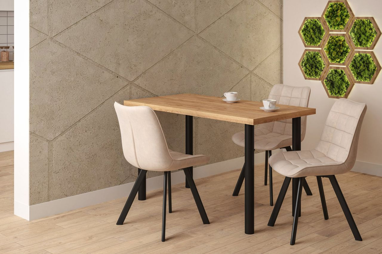 Le plateau effet chêne artisanal apporte une touche naturelle et conviviale, tandis que les pieds métalliques noirs renforcent le caractère moderne de cette table. Un duo de matières qui sublime aussi bien les espaces clairs que les ambiances loft.