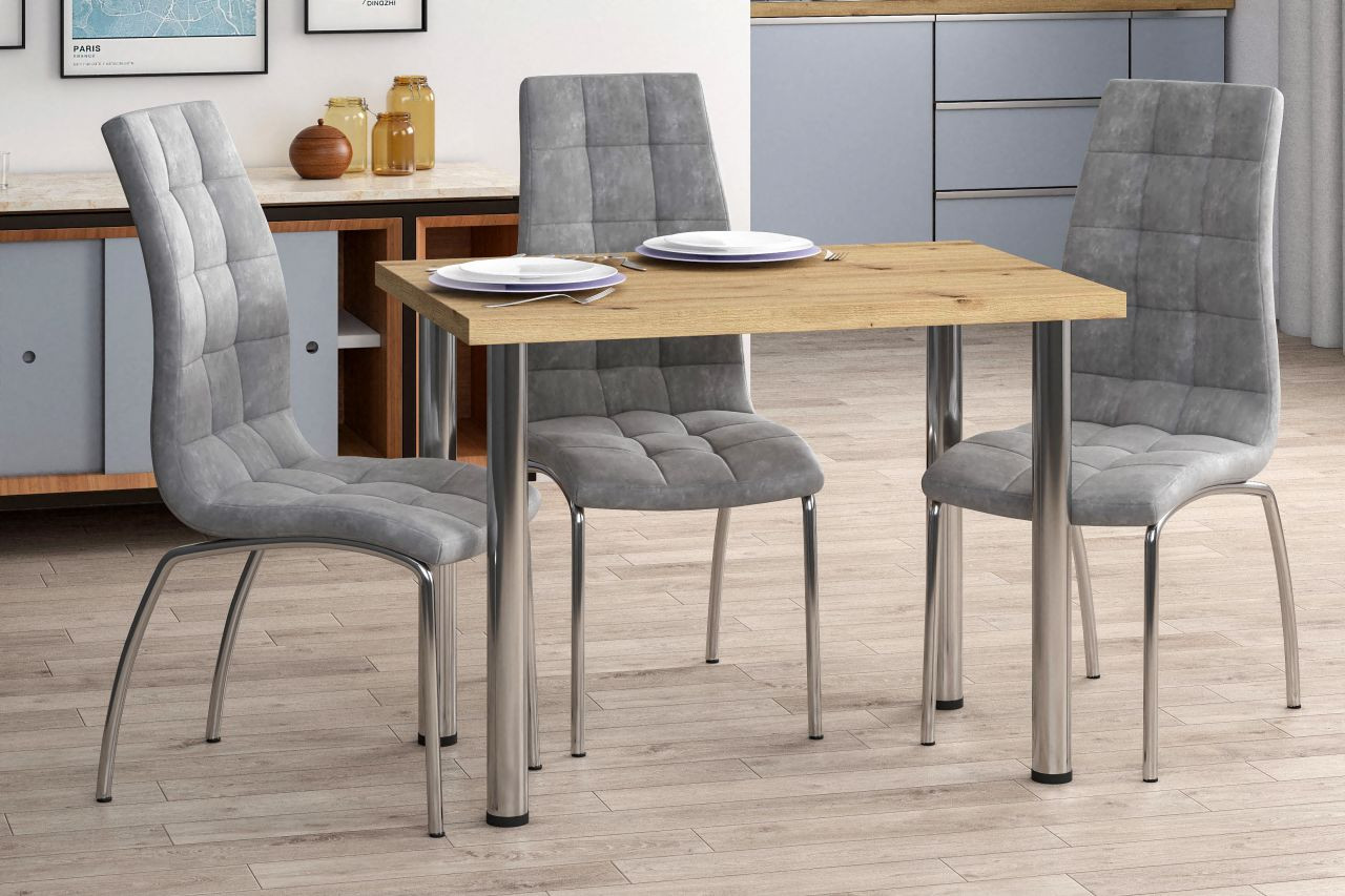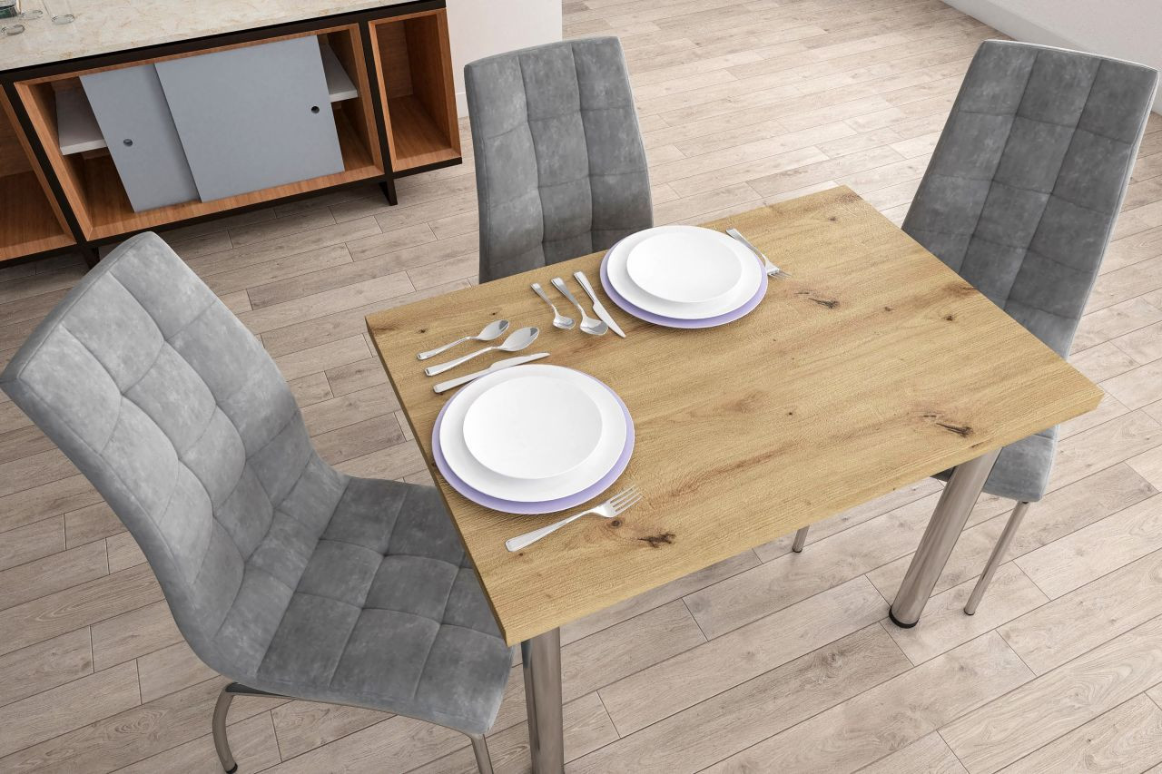 Avec son plateau effet chêne artisanal et ses pieds cylindriques chromés, la table Milano Compact apporte une touche de clarté et de modernité. Son design sobre s’adapte aussi bien aux cuisines contemporaines qu’aux salons épurés.