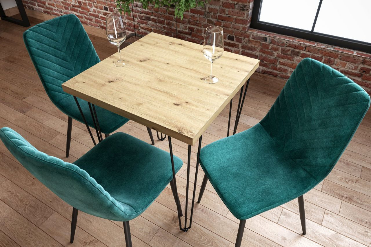 Les pieds filaires noirs offrent une impression de légèreté tout en garantissant une excellente stabilité. Le plateau effet chêne artisanal apporte une touche naturelle et chaleureuse, parfaite pour les espaces repas cosy ou les cafés modernes.