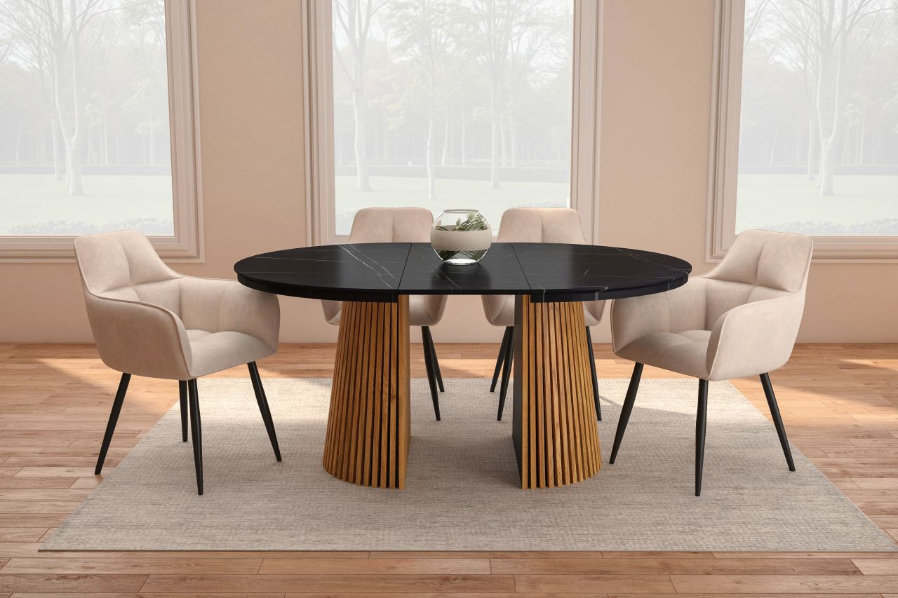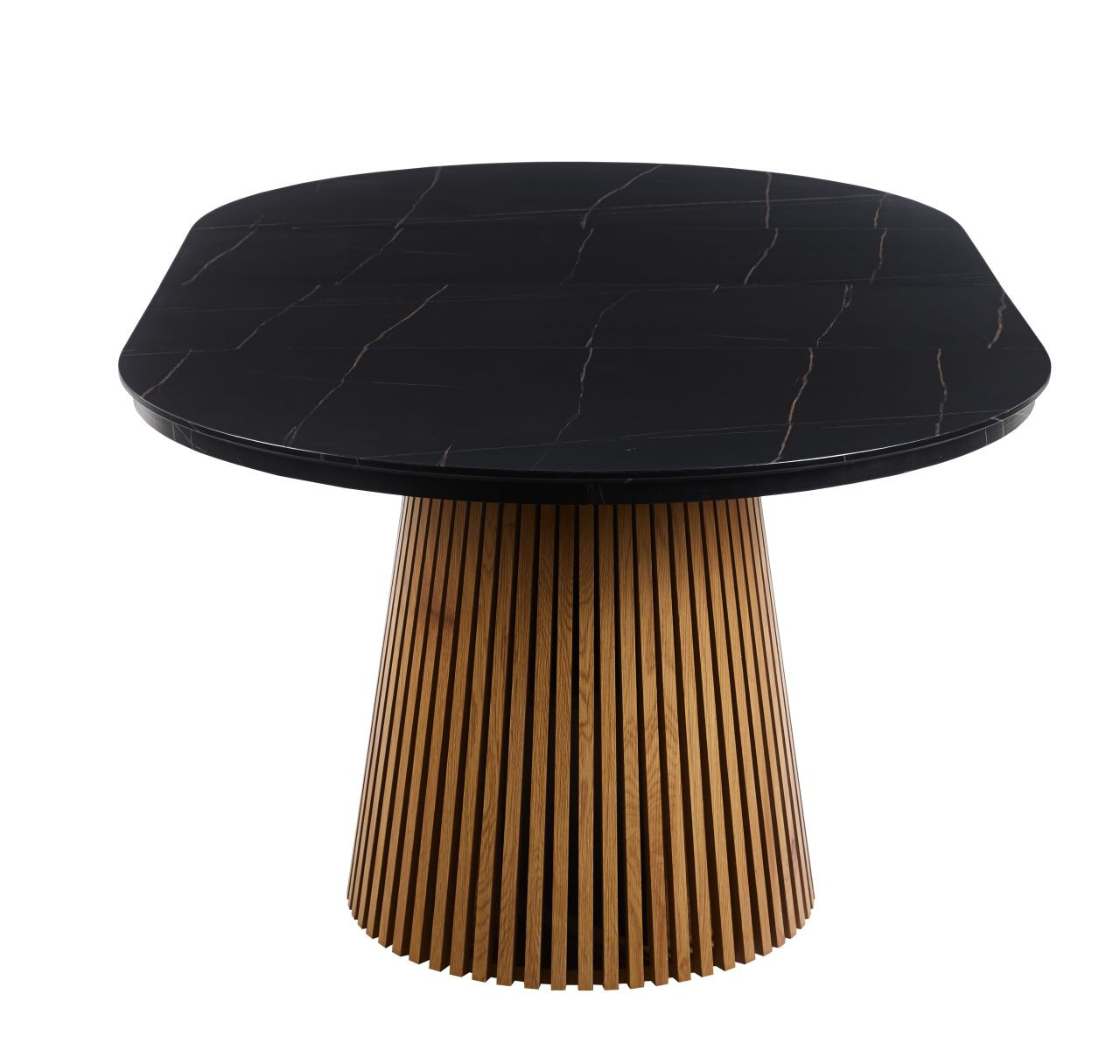 La table Spine Marbre Noir extensible allie un plateau élégant effet marbre noir à une base sculptée en bois aspect chêne. Moderne, pratique et raffinée, elle s’adapte à toutes les occasions grâce à ses rallonges intégrées jusqu’à 200 cm, offrant un espace repas aussi convivial qu’esthétique.