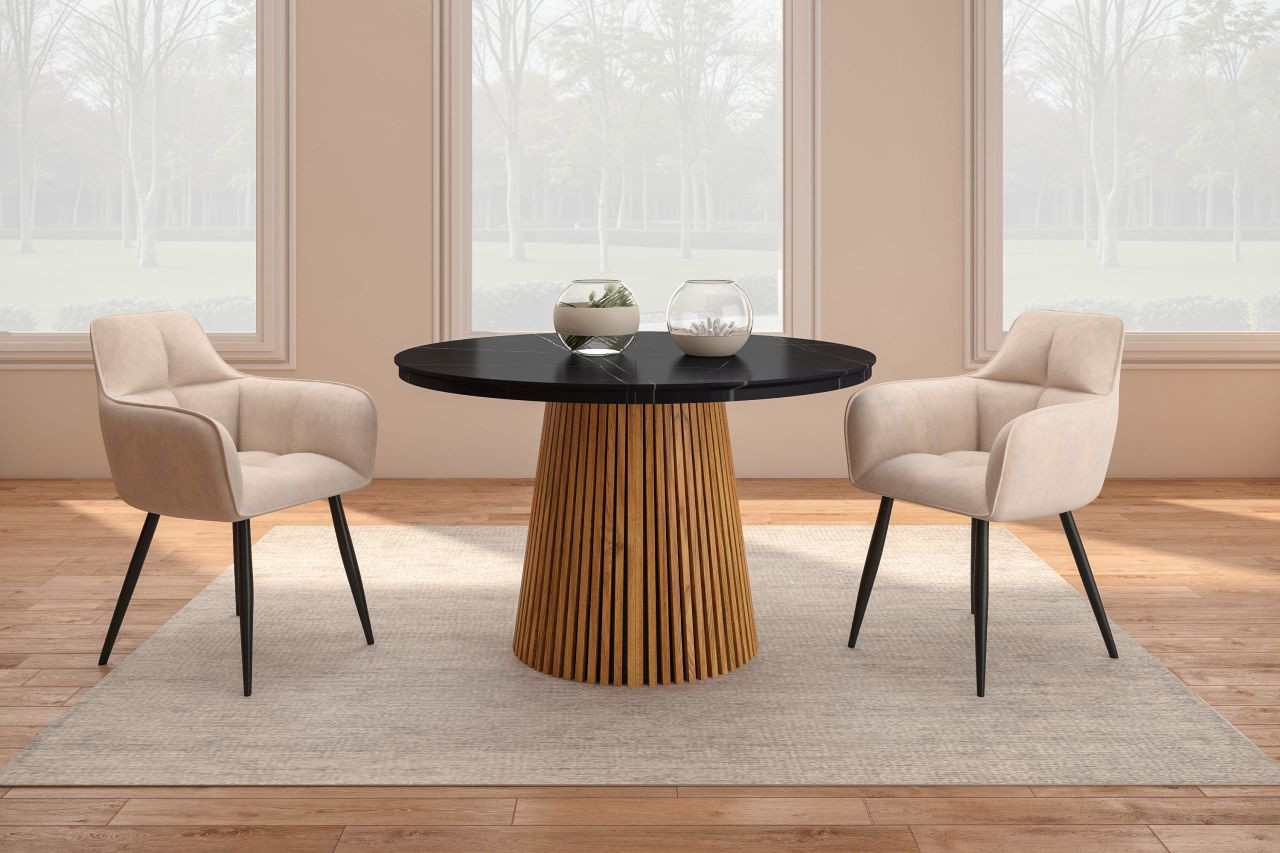 La Table Spine Marbre Noir extensible effet marbre noir & aspect chêne séduit par son allure moderne et luxueuse. Son plateau rond effet marbre noir apporte une touche élégante, tandis que sa base conique en bois aspect chêne offre un contraste chaleureux et sophistiqué. Son design sculptural en fait une pièce maîtresse de votre salle à manger.