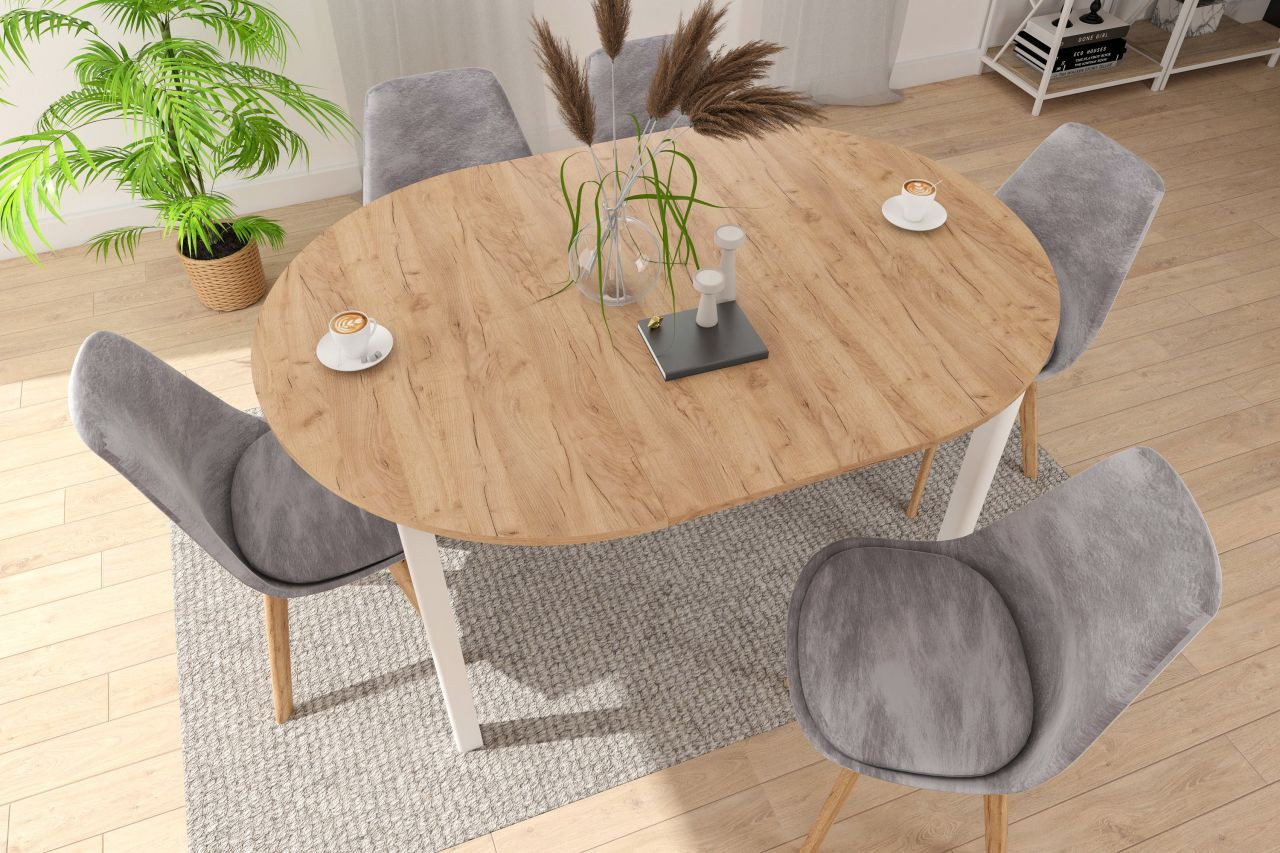 La Table Livia Golddeco incarne l’élégance nordique avec son plateau rond aspect chêne doré et ses pieds blancs. Extensible jusqu’à 140 cm, elle combine esthétisme et praticité pour accueillir jusqu’à 6 convives.