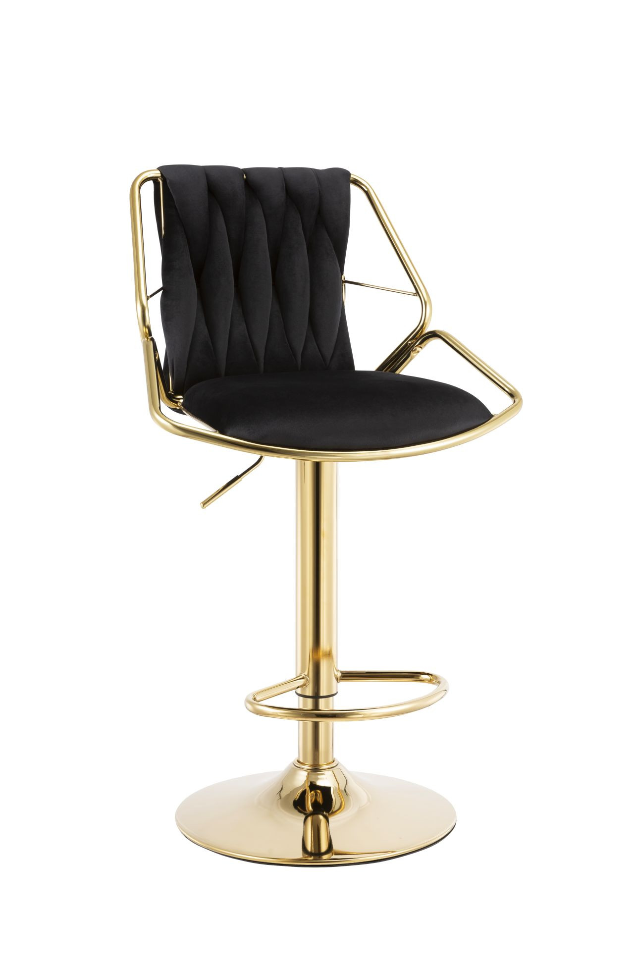 Le tabouret de bar RIBEIRA en velours noir et structure dorée brillante marie raffinement et confort. Son design capitonné et son assise ajustable ajoutent une touche luxueuse à tout espace de vie.