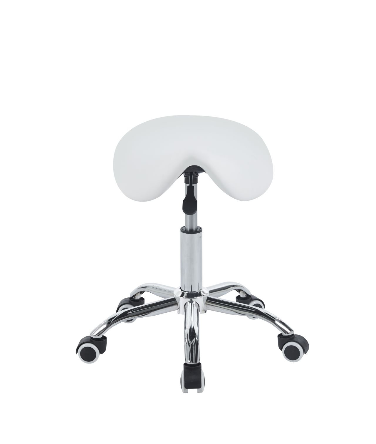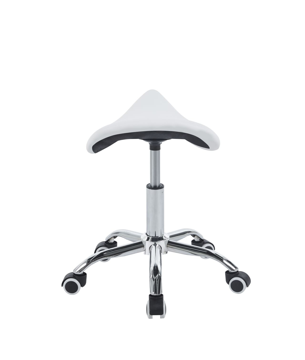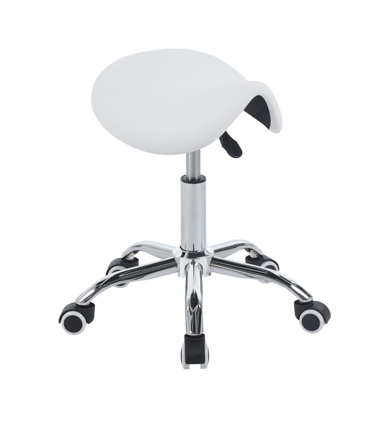 Tabouret selle à roulettes blanc, design ergonomique et réglable. Assise similicuir PVC et base chromée pour un confort optimal et une mobilité fluide au quotidien.