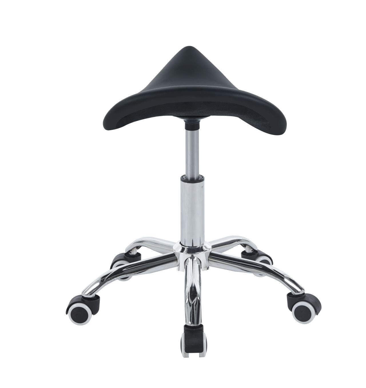 Tabouret selle ergonomique à roulettes, assise similicuir noir et base chromée. Hauteur réglable pour un confort optimal. Idéal bureau, atelier ou espace de travail.