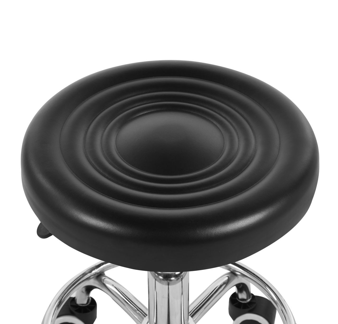 Tabouret à roulettes en similicuir noir avec hauteur réglable. Confortable, stable et mobile grâce à sa base chromée pivotante et ses roulettes silencieuses.